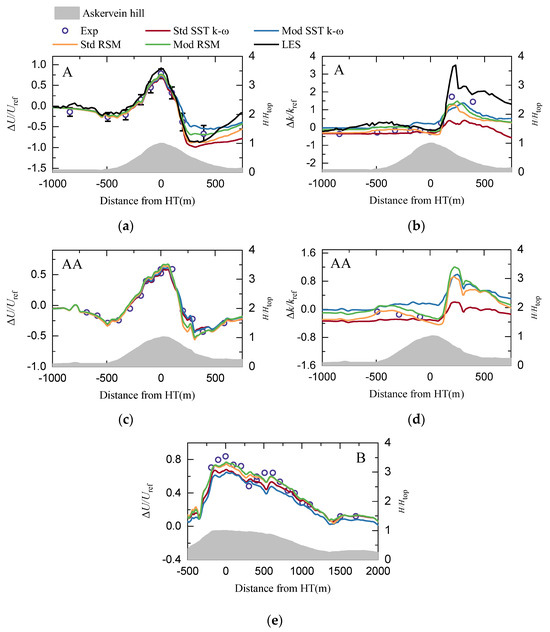 From Figure 11, all of the four RANS models underestimate the TKE on the leeward slope, while the TKE in the LES model is larger than the experimental value because the incoming TKE in the LES model is also larger (as seen in Figure 9). However, the large TKE of the LES model on the leeward slope also indicates that the experimental data here may have been underestimated, and that the RANS model has a limited predictive capability of the inverse pressure gradient, resulting in insufficient TKE generation. On the leeward slope, the result of the Mod RSM model (eTKE,max(A-leeward) = 28.46%) and Mod SST k-ω model (eTKE,max(A-leeward) = 29.89%) are relatively better, while the Std SST k-ω model (eTKE,max(A-leeward) = 51.33%) seriously underestimates the TKE. On the windward slope, the TKE of the Mod RSM model is slightly larger than the experimental value, as the measurements obtained with the Gill anemometer may be about 20% lower than those of the Sonic anemometer [40]. It can also be seen on line AA and line B that the prediction results of the Mod RSM for the TKE are more appropriate.