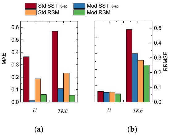 Statistical errors of numerical results for Cases 1–4. ‘MAEStd SST’ and ‘RRMSEStd SST’ stand for the values of the Std SST k-ω model.