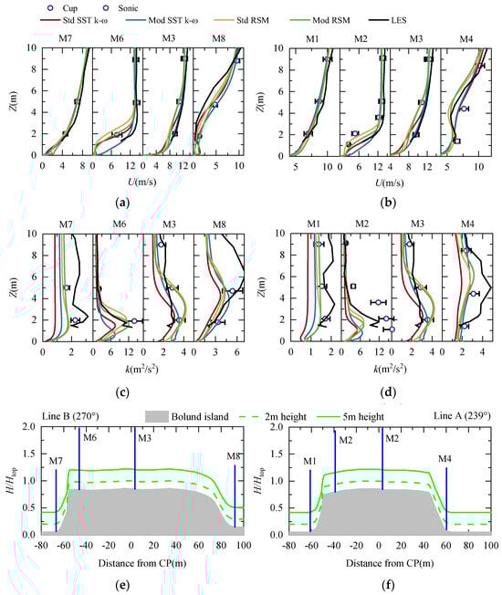 Figure 14 shows the four RANS turbulence models for the wind speed over the island. Along lines B and A, the numerical results are better above the 2 m height. Below 2 m, some measurement points deviate from the experimental values, and similar conclusions can be found in reference [10]. The differences in the wind speed predictions between various RANS turbulence models are also evident near the ground due to the separation and reattachment of the wind flow. The size of the separation zone with different turbulence models can be seen in Figure 15, especially near M6 and M8, where the differences in the separation zone is obvious. Similar to Case 1, the standard models have larger separation zones in the leeward slope. Although, for M3, the LES model is more accurate at a 2 m height, for M6 (M2), it is larger than the experiment at a 2 m height, so the LES model also has some errors on the whole.