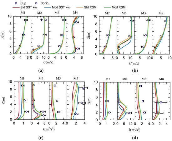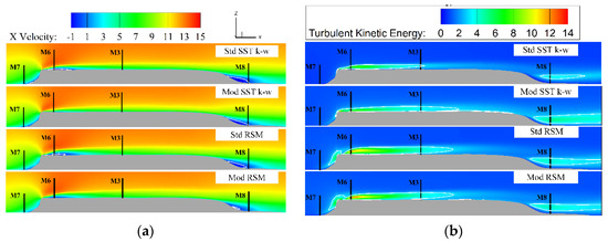 Along lines B and A, it can be seen in Figure 14 that the TKE of the Std SST k-ω model is smaller than the experimental value at all measurement points, and the Mod RSM model has better predictions of the TKE than the Std RSM model and the Mod SST k-ω model, which can also be seen in Table 4. It can be seen from Figure 14 and Figure 15 that the Std SST k-ω model generates less turbulent kinetic energy around M6 and M8 than the other models due to the TKE decay and the limitations of the turbulence model itself. The Mod RSM model produces a relatively larger TKE, but this is still inadequate at M6 and M2 near the ground. The prediction of the turbulent kinetic energy behind the cliff is always a challenge for turbulence models, and similar conclusions were found in the literature [10,48].