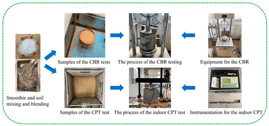 (1) Indoor CBR Test Method. According to the relevant provisions of the “Test Methods of Soils for Highway Engineering” (JTG 3430-2020), the sample is prepared by the compaction molding method. The mass of the required specimen was calculated according to the compaction degree and water content. Among them, the compaction degree is calculated as “the ratio of the dry density of the sample to the standard maximum dry density”. From this, the total sample mass can be determined from the compaction, sample volume, and maximum dry density. When the soil’s moisture content exceeds the liquid limit, it becomes impossible to prepare high-ice-content permafrost samples by simply adding water. To address this, an ice crusher is used to crush ice to pass through a 2 mm sieve to produce ice sand, which is then mixed with ice water. The total mass of the sample (m), dry soil mass (ms), added water mass (mω), and added ice sand mass (mi) are calculated according to Equations (1)–(4). During sample preparation, the mixture is poured into the mold in three layers, each compacted as per the prescribed number of impacts. After compacting the first layer, the surface of the specimen is “roughened” before adding more mixture and repeating the steps in layers. In highway engineering, CBR specimens are typically soaked for 4 days; however, for this experiment, considering the permafrost conditions, the formed specimens are immediately wrapped in cling film and placed in a low-temperature environmental chamber for temperature control, using sensors to monitor the internal temperature. After stabilizing the temperature for 1 day, a penetration test is conducted, measuring the unit pressure (p) and penetration depth (h). The bearing ratios at penetration depths of 2.5 mm and 5 mm are calculated using Equations (5) and (6), with the higher value taken as the CBR value. The CBR penetration test setup is shown in Figure 1.
