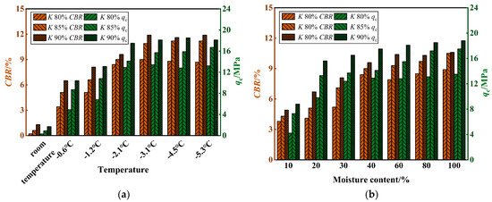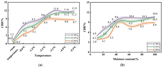 Variation in soil sample CBR values with temperature and moisture content: (a) variation in CBR values with temperature for a sample with 40% moisture content; (b) variation in CBR values with moisture content for a sample at −2.1 °C.
