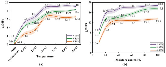 As shown in Figure 3a, at room temperature with a moisture content of 20%, the qc of the soil sample is relatively low. This low resistance is due to water molecules adsorbed on the surfaces of soil particles, forming intermolecular adhesive forces that reduce the cohesion on the surface of the soil particles, thereby diminishing the soil’s strength. When the degree of K is constant, the qc increases as the T decreases. Above −2.5 °C, for every 1 °C decrease in temperature, the qc increases by approximately 30%. Below −2.5 °C, the qc tends to stabilize with changes in temperature. This stabilization occurs because, as the temperature decreases, the content of unfrozen water decreases, the degree of ice saturation increases, and the strength of the ice enhances. However, as the temperature continues to drop, the ice content and strength gradually stabilize, leading to an initial increase and subsequent stabilization of the cone tip resistance (qc).
