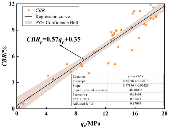 Figure 4 presents a comparison of qc and CBR values at various temperatures (T) and moisture contents (ω) for soil samples. It is evident that for compaction degrees of 80%, 85%, and 90%, both qc and CBR values initially increase and then stabilize as the T decreases or ω increases. This is similar to the results of Arbianto’s research [24], which states that there is a functional relationship between CBR and qc. Although permafrost is different from non-permafrost soil, from the mechanical point of view, the change pattern of both tests is a reflection of the bearing capacity of the soil. This similarity in trends is because both test methods are penetration tests. Despite differences in probe dimensions, penetration rates, and depths, the penetration process is influenced by the soil’s particle structure and moisture content. Both test metrics reflect the compressive resistance and localized shear strength of the soil under a given load. Consequently, changes in temperature and moisture content positively correlate with CBR values and qc. Thus, the Pearson correlation coefficient method is used for further analysis. The Pearson correlation coefficient (r) quantifies the strength of a linear relationship between two variables, with |r| closer to 1 indicating a stronger linear correlation. Using Equation (7), the Pearson correlation coefficients were calculated and are presented in Table 3, showing values of 0.927, 0.934, and 0.94 for the three compaction levels, respectively, all close to 1. The corresponding significance levels (Sig) are all less than 0.05, indicating statistically significant positive correlations with strong linear relationships. Regression analysis can thus establish a functional relationship between the two.