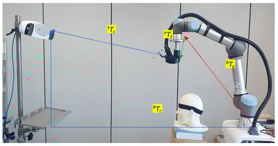The remainder of this paper is organized as follows: Section 2 describes the method of calibrating the coordinate system between the camera and the base of the robot manipulator. Section 3 explains the planning of the trajectory from the initial pose to the target pose until the TMS coil contacts the head. Section 4 describes the force and torque control strategies used to improve the accuracy and contact. Section 5 describes the manner in which the robot manipulator tracks the target point when the subject’s head moves. Section 6 describes the experimental setup and processes, and Section 7 presents the experimental result. A discussion of this study with the future work is presented in Section 8. Finally, the conclusions of this study are presented in Section 9.