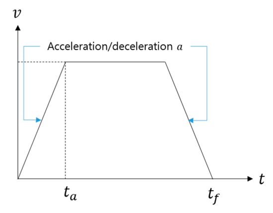 All trajectories in this study are planned using the trapezoidal velocity profile method [28] without the third phase. The trapezoidal velocity profile method is used to plan trajectories based on the trapezoidal velocity–time graph shown in Figure 3. The symbols in the graph are defined as follows: is the acceleration/deceleration during the accelerating/decelerating periods and is the total time required to execute the planned trajectory. If the trajectory length is fixed, these parameters are not independent; that is, some parameters can be determined if others are specified. For safety considerations, the values and are specified. The trajectory length can be determined by calculating the area of the trapezoid surrounded by the velocity profile curve and -axis in Figure 3, given by . From this equation, we can derive