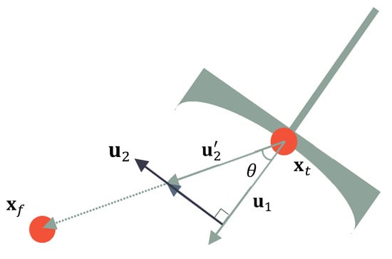 where F denotes the magnitude of what is generated by the coil. How the weight between the force and position controllers was decided is described in the orange and green block in Figure 7. In this control scheme (9), the role of the term including is the force controller, which maintains contact between the coil and the head. The role of the term including is the position controller which compensates the error between the coil’s current and target positions. Even if does not consider the component of the error parallel to the orientation of the coil, it does not matter because will compensate for that by adjusting the coefficients and from (9). Meanwhile, if the target point estimated by the navigation system is located above the head, the coefficient makes the error larger. This is because while the force control is trying to reduce the magnitude of the error, which is parallel to , the error component parallel to becomes larger owing to both orientations being opposite in this situation. In other words, can be near . However, adhering the coil to the head rather than compensating for the error is more important if the coil is not too far from the estimated target point. The force control described above is shown in Figure 7.