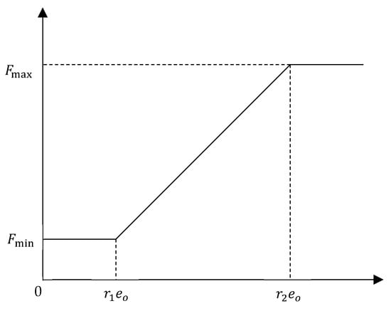 SInce the incurved coil case contacts the head with a larger area than the flat one, a larger force is required to rapidly reduce the coil’s position error. However, transferring a larger force to the head for a longer time makes the subject uncomfortable. To solve this problem, is scheduled based on the coile position error, as shown in Figure 8. The maximum force is set for the safety and hardware limitations. The minimum force is set to maintain contact between the coil and head. is the coil error when the manipulator begins the force control. e is the coil’s current error. and are the scaling factors for determining the error interval where F varies linearly with e.