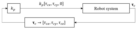 where is the measured torque acting on the center of the coil’s floor, and is the proportional gain of the torque control. Since it is similar to P (proportional) control, where the desired torques along the x- and y-axes are zero, it is referred to as “proportional torque control” in this study. The coordinate system of and are the same as the tool’s. The z value of τ is zero because it cannot tilt the coil, hence it rarely affects the adhesion. This overall control is described visually in Figure 9.