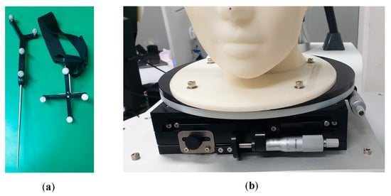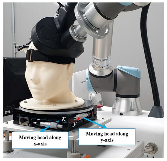 A Polaris VEGA ST camera was used for our navigation system in our experiment, together with an NDI passive marker and NDI stylus (Figure 10). One marker was attached to the coil to calibrate the camera and robot manipulator (Figure 11). The other one was attached to the headband to estimate the center of the dummy head and the target point of the TMS point. The manipulator used in this research was UR5e from Universal Robot. The robot control program was programmed using Visual Studio C++ 2019 with the ur_rtde library [31], developed by SDU Robotics. A force/torque sensor embedded in the wrist of the robot manipulator was used to measure the force and torque. As the sensor does not have high accuracy or precision [32], it can show that the control strategy in this study can be used with inexpensive force/torque sensors. The TMS coil used in this study was developed by AT&C. The distance between the robot manipulator and the camera was approximately 2.3~2.5 m, and the dummy was located based on the measurement volume of Polaris VEGA ST [33] and the manipulability of the robot manipulator. Moreover, the dummy was moved by adjusting the micrometer of the dummy stage (Figure 12) to test the target point tracking algorithm.