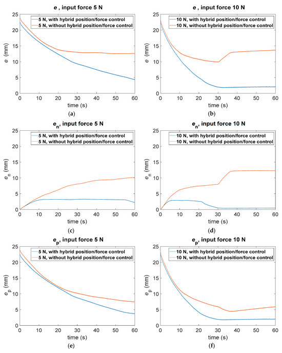 Comparison of e, , and when the hybrid/position force is used or not: (a) when the input force is 5 N; (b) when the input force is 10 N; (c) when the input force is 5 N; (d) when the input force is 10 N; (e) when the input force is 5 N; and (f) when the input force is 10 N.