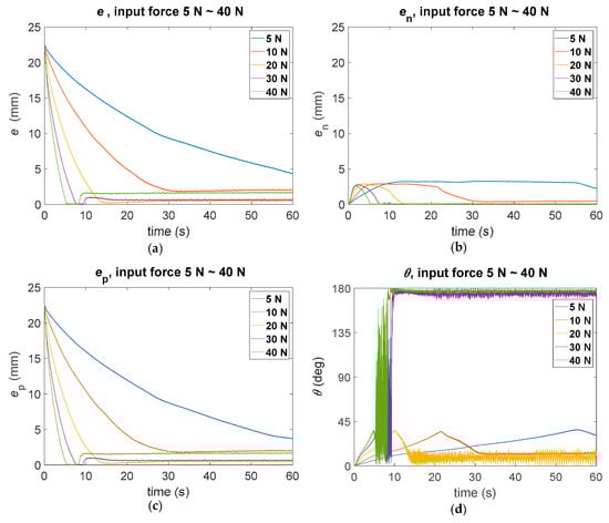 Comparison of e, , , and for each desired force: (a) ; (b) ; (c) ; and (d) .