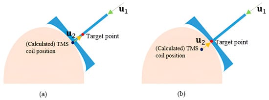 Two cases where is opposite to : (a) When the navigation-estimated target point is above the head; (b) When the calculated TMS coil position is inside the head.