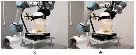 Some studies used the force/torque control strategies of a robot manipulator, which are methods to regulate the contact force between the robot manipulator’s end-effector and the environment, to improve robotized TMS systems. The first case is that of Zakaria [26]. Using adaptive force control and a neuro-fuzzy algorithm, he composed a system that can track slight head movement and improve safety. In the same year, Ritcher et al. [22] suggested a method for controlling the interaction force between the coil and the subject’s head by moving the coil in the direction of the end-effector of the robot manipulator or in the opposite direction. Jaroonsorn et al. [27] used a hybrid position/force control to maintain a constant interaction force between the head and the coil while compensating to ensure the position error. Noccaro et al. [21] used impedance control for the safe interaction between the coil and head.
