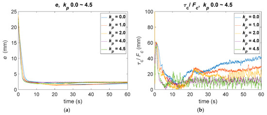 From Figure 18a, it can be seen that a larger reduces e more slowly during the initial period of the experiment and increases the steady-state e value. However, this is not very meaningful: the difference between the maximum and minimum times to the first time the value of e decreases below 5 mm is 1.244 s. The maximum error difference between each after 10 s from the start of the experiment was less than 1.1 mm. Thus, was decided by the values, as shown in Figure 18b. It is shown that the larger , the lower value after around 20 s from the start of the experiment. Meanwhile, using a larger than 4.0 made a large oscillation to that value, so it makes the coil pose unstable. It is natural that if the proportional control gain of the PID control system is very large, it makes the system unstable because of the large overshoot. From these results, is chosen.