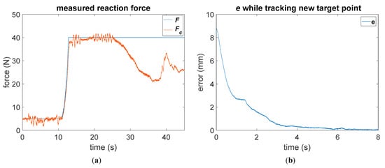 As shown in Figure 16, the error was reduced rapidly, as intended, and the converged e value was less than 3 mm. The large force over 20 N was applied to the head briefly—less than 10 s. From these results, (14) was used for the desired force of the force controller.