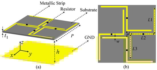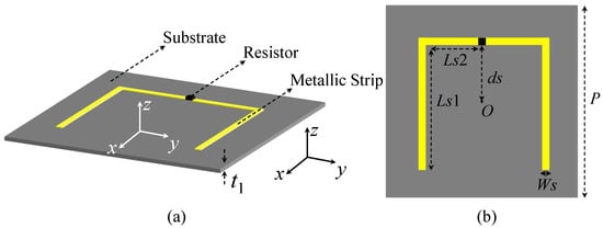 In the first step of the low-RCS 1-bit RTA design process, the AFST element is analyzed and designed. The AFST needs to have the abilities of out-of-band absorption and in-band transmission while maintaining a low profile and simple structure. To achieve these goals, multi-resonant modes on the metallic strip are used, with different functions assigned to different modes using a loading resistor. The element of the AFST is shown in Figure 2, where a bent metallic strip is printed on a dielectric substrate with a relative dielectric constant of 3, and a lumped resistor is loaded in the center of the strip. The element has a period P of 20 mm, with approximately a half wavelength corresponding to the frequency , and the total length of the metallic strip is 40 mm, which is roughly equal to one wavelength corresponding to the frequency . The other physical parameters are listed as follows: mm, mm, mm, mm, mm, and .