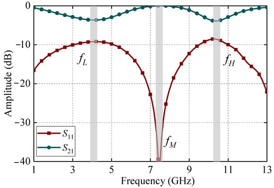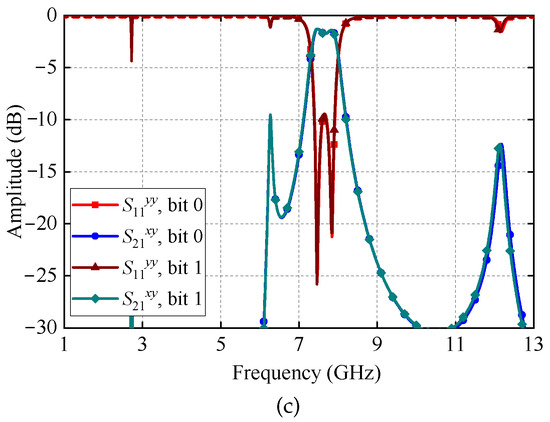 The designed AFST structure was simulated to verify its abilities of out-of-band absorption and in-band transmission. In order to obtain the simulated S parameters of AFST, the element structure shown in Figure 2 was modeled in the HFSS 2021.R1 commercial software, and then the periodic boundary condition was set to fit the infinite array situation, and Floquet port excitation was used to fit the plane wave incidence [24]. Moreover, the incident wave was y-polarization. Figure 3 shows the simulated reflection and transmission parameters. It was found that the incident wave around GHz and GHz was absorbed, although the absorptivity was not very high, which can be significantly improved by adding a ground under the structure. In contrast, at GHz, the incident wave passes through with low insertion loss. Therefore, the designed AFST structure can be applied to the low-RCS 1-bit RTA to achieve out-of-band RCS reduction. In addition, it is worth mentioning that although the three resonant frequencies are multiples, and can be separately regulated by adding stubs at appropriate locations [25].