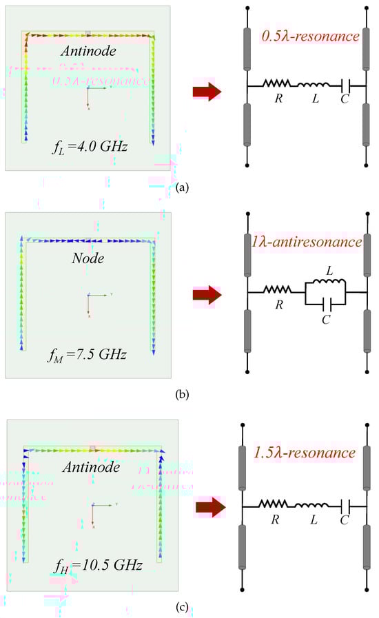 Simulated current distributions and their corresponding equivalent circuit models at different resonant frequencies: (a) , (b) , and (c) .