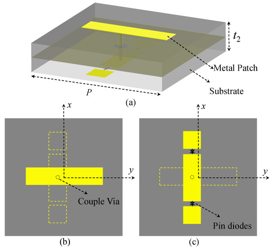 The proposed 1-bit RTA element is shown in Figure 7, which employs a receiver–transmitter structure with an active receiving dipole and a passive asymmetric transmitting dipole. Both dipoles, separated by a common ground and connected by a metallized via-hole, are linearly polarized and aligned in the orthogonal direction. Two pin diodes are integrated on the active dipole and biased in opposite states to reverse the current on the active dipole, which essentially results in a 180° phase difference, thus enabling a wideband 1-bit phase. The ON and OFF states of the pin diode are modeled as and series circuits, respectively [26]. Specifically, in the ON state, the resistance and inductance are and nH, respectively. In the OFF state, the resistance, inductance, and capacitance are , nH, and pF, respectively. The element has a period P of 20 mm, a thickness of 4 mm, and a substrate with a relative dielectric constant of 3.