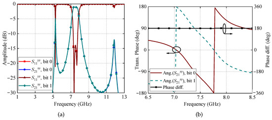 Figure 8 illustrates the simulated S parameters of the designed RTA, including its amplitude and phase. The results indicate that the structure has achieved a good polarization converter transmission performance in 7.3∼7.75 GHz, with two resonant frequencies in the band. These resonant frequencies are generated by the half-wavelength resonance of the top dipole, which are then differentiated into two frequencies through the coupling of the metallic via-hole. The insertion loss of the passband is approximately 1.2 dB, which is mainly attributed to the resistance loss of the pin diode. Furthermore, Figure 8b depicts the transmission phase under different states, demonstrating that a 180° phase difference can be constructed within the transmission band through the pin diode, thus achieving a 1-bit electronic RTA.