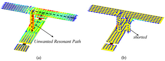 However, it should be noted that the structure has an unexpected resonance point near 5.3 GHz, which may deteriorate the absorption performance of the AFST at this frequency. Therefore, it is necessary to eliminate this resonance frequency. Through observing the current distribution at the resonant frequency of 5.3 GHz, as shown in Figure 9a, an unwanted resonant path is generated through the bottom dipole, via-hole and the top dipole, as indicated by the black dotted line. To break this resonance, a shorted metallic via-hole is added to the top dipole to forcibly change the resonant path, as shown in Figure 9b. It can be seen that the resonant path is broken because it is connected to GND through the shorted via-hole, thus the polarization converter transmission performance will be eliminated. Figure 9c shows the simulated S parameter after adding the shorted via-hole. It can be observed that although the resonant frequency at 5.3 GHz moves to 6.25 GHz, the co-polarized reflection coefficient at this frequency is greater than −1 dB, which has little influence on the out-of-band absorption performance. Notably, the shorted via-hole can also be reused as a ground through-hole for the biasing voltage, providing a 0 V voltage to the pin diode.