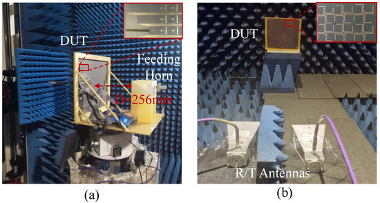 The measurement process consists of two parts: RCS reduction evaluation and radiation performance measurement. Therefore, two different measurement systems are set up to complete the measurement process, as illustrated in Figure 12. The setup shown in Figure 12a has the prototype in a near-field anechoic chamber and acts as a transmitting antenna to measure its beam scanning performance. On the other hand, the fabricated prototype was placed in an anechoic chamber that was irradiated with a pair of linearly polarized horn antennas. Then, the reflection coefficient differences caused by adding an AFST layer to the RTA layer was calculated, which can be used to characterize the RCS reduction, as shown in Figure 12b. During the measurements, the environment noise of the anechoic chamber is about −80 dBm, and the signal-to-noise ratio can be guaranteed to be about 30 dB.