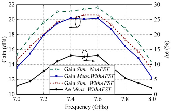 The simulated and measured gain of the designed low-RCS 1-bit RTA prototype at different frequencies is illustrated in Figure 13. It is seen that loading the AFST on top of the 1-bit RTA will result in a gain loss of about 1 dB. The measured realized gain at 7.5 GHz is approximately 20.1 dBi, with a corresponding aperture efficiency of 12.7%, and the 3 dB gain bandwidth is about 8.7%. Moreover, the radiation efficiency of the design RTA is around 65∼70%. Compared to the simulated results, the measured gain is reduced by approximately 0.6 dB, and the gain bandwidth is also slightly reduced. In taking into account machining and measured errors, the slight warping of the AFST layer, and the parasitic effect of the pin diode, the results are considered acceptable.