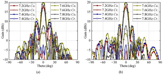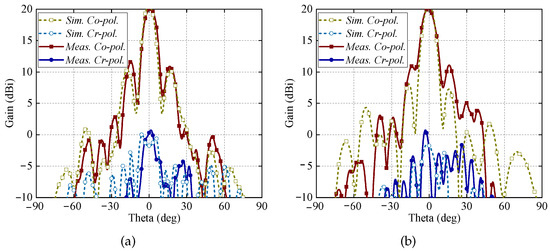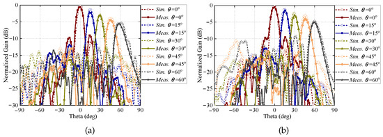 The simulated and measured broadside radiation patterns at 7.5 GHz are shown in Figure 15. It is found that the simulated and measured results are in good agreement. The measured half-power beamwidths (HPBWs) are 10.4° and 10.8° in the E- and H-planes, respectively. Additionally, the measured cross-polarized level is less than −20 dB in both principal planes. The simulated and measured beam scanning performances at 7.5 GHz in both principal planes are shown in Figure 16. It is evident that the beam accurately reaches the expected direction within the range of 60°, and the scanning gain loss is about 5 dB in both principal planes, which is mainly affected by the phase compensation errors. This can be addressed using either two-bit phase compensation or smaller array elements.