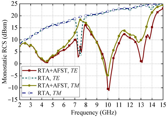 Simulated monostatic RCS of the 1-bit RTA with and without AFST for both TE and TM polarization.
