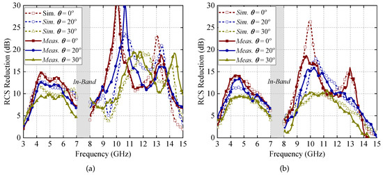 The RCS reduction performance of the prototype can be observed from the simulated and measured results. The simulated results are obtained using the CST 2021 commercial simulation software with plane wave excitation and open boundary conditions. It is seen that the integration of AFST on top of the RTA effectively reduces the out-of-band RCS under both the TE and TM polarized incident waves, as shown in Figure 17. Specifically, the 10 dB RCS reduction bandwidth for low and high frequencies is 52.5% and 43.8%, respectively. The RCS reduction performance under oblique incidences is given in Figure 18. It is found that the RCS reduction performance of low frequency is relatively stable at oblique incidence, while the RCS reduction performance of high frequency has band shift. In general, in the case of a 30° oblique incidence, the designed low-RCS 1-bit RTA can maintain a relatively stable RCS reduction performance.
