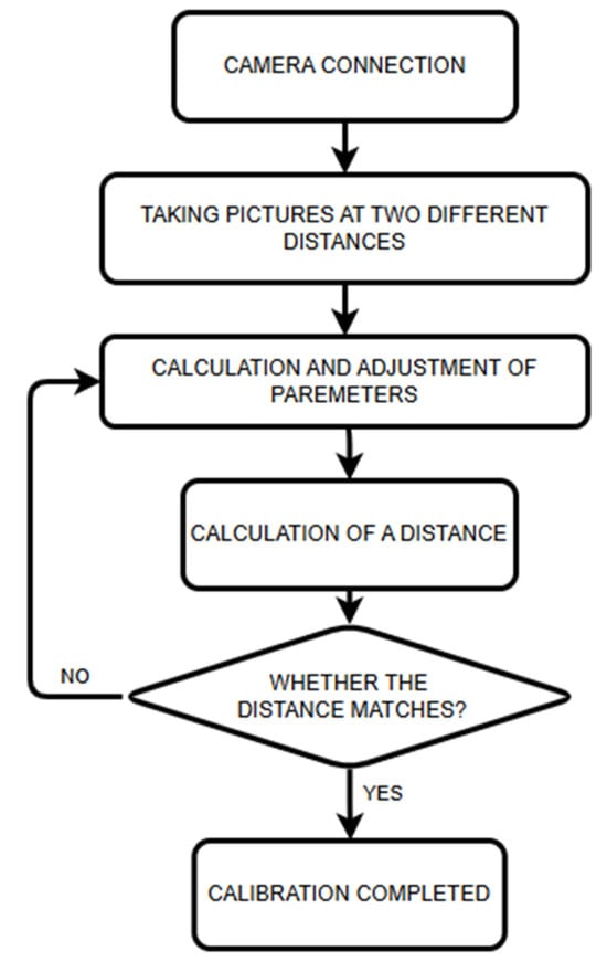 Y-axis displacement), and changes in object surfaces. These costs are crucial to correctly matching objects detected in images from the two cameras, as they make it possible to determine exactly which elements in one image correspond to elements in the other image. The process involves analyzing the differences between the images and finding the best match for each object, which is necessary to calculate the distances to those objects. The script matches objects between images and then calculates the distances to those objects, taking into account the known distance between cameras and viewing angles. An important aspect of this process is the calculation of the focal length and angle tangent, which are necessary to accurately calculate the final distance to the objects. The focal length is a parameter that describes the ability of a lens to focus light, which is crucial in determining image scaling. The angle tangent, on the other hand, refers to the ratio of the distance between cameras to the distance to the object in the scene. The final distance away is calculated on the basis of these parameters, allowing you to accurately determine the distance to objects in the scene. If, after entering the calculated parameters and subjecting the uploaded images to analysis, the final distance agrees (30 or 50 cm), then the measurement has been made correctly. This was the basic calibration of the cameras using images from two distances, which provided the necessary camera parameters, namely the focal length and angle tangent, which will be used to estimate the distance of objects in other positions as well. In short, the calibration of the system consisted of taking images from both cameras at two known distances from the object. On the basis of the known parameters of the cameras, the distances between them, and image analysis, the necessary system parameters were determined. With these, the system was able to calculate the distances to objects based on new images at other distances. The calibration process is shown in the flow chart in