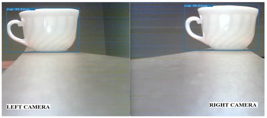 The methodology of the study included a test conducted on two objects: a white teacup and a LEGO human figure, as the previously mentioned identifying models detect them without any problem. The cup is 67 mm high and 105.5 mm wide (measured with the handle), with a diameter of 86.4 mm. The LEGO figure, on the other hand, is 40.3 mm high, 24.5 mm long, and 7.7 mm wide. Thanks to the discrepancy in the dimensions of the two test pieces, it will also be possible to assess the effect of the objects’ dimensions on the precision of the measurements. The experiment was carried out for distances ranging from 20 to 70 cm, increasing the distance by 2.5 cm. Three measurements were made for each distance, allowing a large amount of data to be collected. Such accuracy and repeatability of the measurements enable reliable analysis and verification of the results, assessing the estimation of the distance between cameras and objects. With such a wide range of data, it is also possible to determine the impact of different distances on the accuracy of the measurement and the calibration of the system.