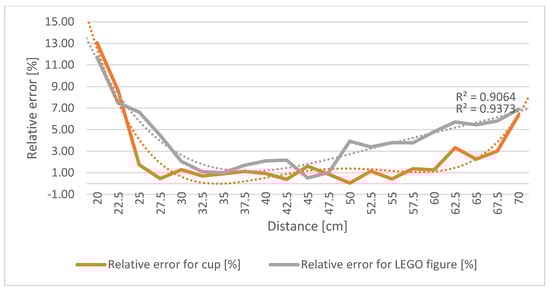 The same situation is the case with the measurements of the LEGO figure; a certain range of distances is visible for which the absolute errors are much lower than 1 cm. This is the range of 30 to 47.5 cm, and the average absolute error of this separated interval is 0.56 cm, which translates into a relative error of 1.46%. The measurements obtained indicate high measurement precision, but only one measurement has a relative error of less than 1%, and this is exactly 0.52% at a distance of 45 cm, where the absolute error is 0.23 cm. In this separated range, the highest errors are obtained at a distance of 42.5 cm, where the absolute error is 0.92 cm and the relative error is 2.17%, which is still a good result.