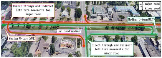 As a key node of road networks, signalized intersections usually serve as the most important way to manage and control urban transportation and vehicle movements [1]. With the increase in vehicle ownership in urban areas, signalized intersections are becoming increasingly busy and congested [2]. Generally, the left-turn traffic within intersections is considered as one of the crucial factors that may cause traffic congestion [3], because it is a real possibility that left-turn traffic passing the intersections collides with the traffic from other directions [4,5]. The crossings of different vehicle movement trajectories within the intersections are called conflict points [6,7]. The existence of conflict points normally causes higher accident rates and severe casualties in the intersections [8]. Given the data from the National Highway Traffic Safety Administration (NHTSA) and Fatality Analysis and Reporting System (FARS), there are almost 9000 fatalities and about 1.5 million injuries caused by left-turn movements occurring annually in the United States [9]. Therefore, to ensure that intersections can operate more safely and efficiently, left-turn traffic should be regularized scientifically. In recent years, shifting and reorganizing the conflict points outside intersections to reduce their number has become a major concern in many unconventional intersection designs [10]. Among them, these unconventional intersection designs include median U-turns, restricted crossing U-turns (RCUTs), and displaced left-turns (DLTs). One of the better-known and more widely used intersections is the median U-turn (MUT) intersection. The concept of the MUT intersection first emerged in the United States, particularly in Michigan, where it has been widely adopted. This innovative intersection is removing the direct left-turn movements of vehicles to accommodate indirect left-turn movements through median U-turns. It only allows the through traffic from major and minor roads to pass through the unclosed median. Figure 1 shows an example of a signalized MUT intersection in Michigan.