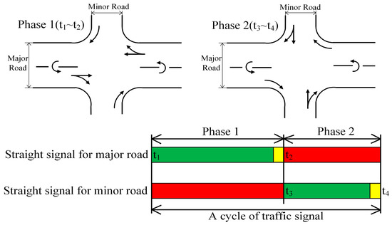 Most MUT intersections have simplified traffic movements by permitting only straight-through movements and indirect left turns. This management approach enables the MUT intersections to utilize a two-phase signal scheme. It assigns the through traffic on major roads and the minor roads into separate signal phases [27,28]. The right-turn traffic on the minor road is not controlled by the signal. The signal phase scheme is illustrated in Figure 4.