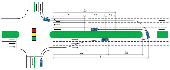 - Fu, D.J.; Zhang, C.B.; Liu, J.; Li, T.; Li, Q.L. Research of the left-turn vehicles lane-changing behaviors at signalized intersections with contraflow lane. Phys. A 2024, 633, 129364. [Google Scholar] [CrossRef]