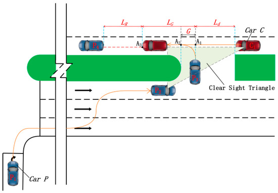 The operation process of vehicles on the minor road crossing the median U-turn is shown in Figure 6. The vehicle on the minor road (Car P) first departs from position P1 to turn right to enter the major road. It will weave with the vehicles on the major road. Then, Car P arrives at position P2 with the average weaving speed vi (m/s) to wait to turn around. When Car P is at position P2, the oncoming vehicle on the major road (Car C) is at position C1. Car C starts decelerating from speed vc (vc > vi) (m/s) with a constant acceleration of ac (m/s2). Car P departs from position P2 to cross the median U-turn via position P3. It can be considered that Car P has completed the turn around when its rear end is appropriately at A2 point. Car C has decelerated to speed vi at this moment; its headstock is appropriately at A1 point. In this paper, we consider the variable G to be the critical gap between Car P and Car C at this moment. The critical gap is a vital factor for vehicle safety operation. It is essentially the drivers’ acceptance of the minimum distance between two adjacent vehicles [36]. The critical gap will be beneficial for determining the maximum gap of the median U-turn to determine its safety effectiveness. After ensuring that there is no collision between Car P and Car C, Car P begins to accelerate in order to quickly pass through the intersection. Then, Car C will maintain a uniform speed of vi until Car P and Car C reach the safe following distance, LR (m). Subsequently, Car C starts accelerating to follow Car P. The movement processes of Car P and Car C are as follows: