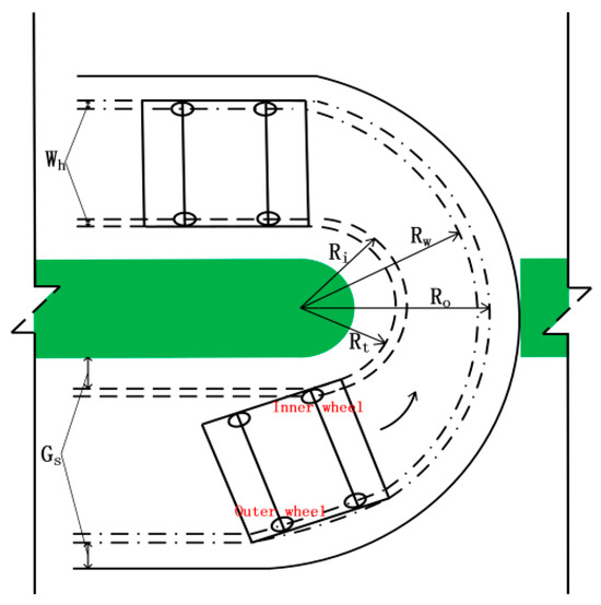 where Rw is the radius of turning around for outer wheels (m), Ri is the radius of turning around for inner wheels (m), Wh is the width of half a vehicle wheel (m), dw is the wheelbase of the vehicle for turning around (m), θw is the outer wheel angle of the vehicle (deg), and θn is the inner wheel angle of the vehicle (deg).