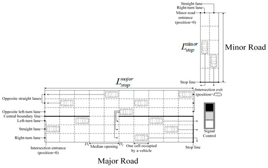 As a specific methodology for describing the macroscopic characteristics of traffic flow, cellular automata have been widely applied to reproduce complex traffic situations in a discrete space [44,45]. In this section, a cellular automata model of a specific MUT intersection is proposed. It describes the operation rules of vehicles within the MUT intersection on the basis of real traffic phenomena. The calculation theory of vehicle delay is also mentioned at the end of this section. The cellular automata model of the MUT intersection is shown in Figure 9.
