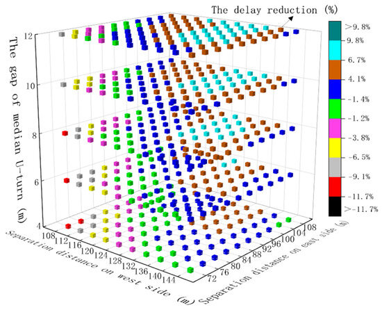 As shown in Figure 13, when the signal cycle is certain, the degree of delay reduction increases with the increase in the green timing percentage. This is because a higher green phase percentage allows more left-turn and straight-through vehicles on the major road to pass through the intersection, which helps dissipate queuing vehicles more quickly and reduces vehicle queuing time. As a result, the degree of delay reduction will be greater. When the green phase percentage of the major road is certain, the degree of delay reduction increases continuously from 60 s to 120 s. However, the delay reduction gradually decreases from 130 s to 150 s. This indicates that appropriately increasing the signal cycle and green phase duration within a specific range is beneficial for improving the traffic efficiency of MUT intersections. However, as the signal cycle and green phase duration continue to increase, the number of vehicles passing through the intersection during the corresponding time will also rise. This may cause drivers of left-turn and right-turn vehicles on the minor road to make more cautious decisions when weaving with the vehicles from the major road. Additionally, excessive vehicles on the major road may form a sufficiently long queue outside the median U-turn. These situations can lead to an increase in delay times. The delay reduction will decrease during a specific signal cycle and duration of the green phase time.