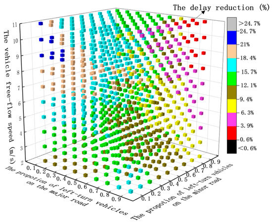 The vehicle free-flow speed and the proportions of left-turn vehicles on both the major and minor roads may critically influence the delay reduction at the modified MUT intersection. In this subsection, the proportions of left-turn vehicles on the major and minor roads are set between 0.1 and 0.9. The vehicle free-flow speed is set between 2 m/s to 11 m/s. All other simulation parameters remain unchanged. Next, the impact of these factors on delay reduction will be analyzed. Figure 12 presents the delay reduction for various combinations of left-turn vehicle numbers on major and minor roads and vehicle free-flow speeds.