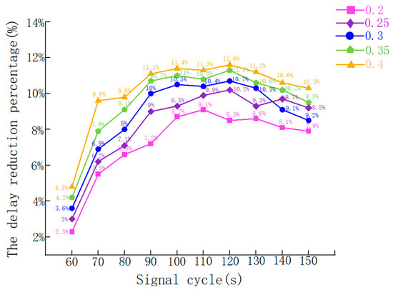 In this subsection, we analyze the delay reduction in the modified MUT intersection under different green phase percentages and signal cycle durations. In typical traffic environments, major roads usually experience higher traffic volumes. Consequently, the settings of the green phase percentage for the major road significantly affect the overall performance of intersections. The delay reduction degree can be observed directly by varying the green phase percentage. Therefore, the percentage of the green phase of the major road is set to 0.2, 0.25, 0.3, 0.35, and 0.4. The traffic signal cycle durations range from 60 s to 150 s. The proportion of left-turn vehicles is fixed at 1:3. The vehicle lane change rate is set at 0.7, and the probability of vehicle random slowing is 0.5. The free flow speed is set to 8 m/s. All other parameters of the cellular automata models remain unchanged. The delay reduction results are shown in Figure 13.