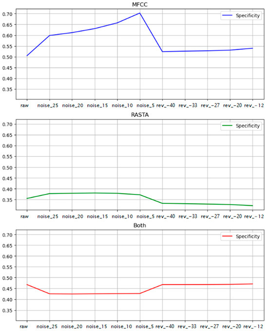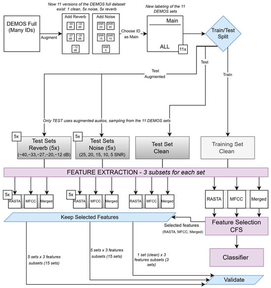 - Each speaker brings 3 one-vs.-all tasks, with 1 for each feature family. Validation data consist of 11 sets (5 noise, 5 reverb, 1 raw) which are evaluated by re-extracting the feature sets selected in the training and passing them to the classifiers. Figure 2 details the abovementioned methodology, outlining the division between raw and augmented versions as well as the extraction of the three feature families.