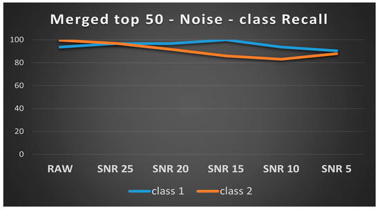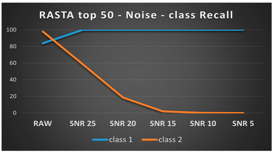 - Regarding noise, we chose the addition of pink noise with varying SNR levels. A pink noise profile was chosen because it is a good approximation of real-world noises, and as its peculiar 1/f curve makes it more prone to be perceptually detected by the human ear. The noise was added by generating a random pink noise signal on MATLAB®, version 9.13.0 (Mathworks Inc., Natick, MA, USA [35]) and by re-weighing it so that its power in dB gave the desired SNR concerning the original signal. Five different SNRs (SNR = 25, 20, 15, 10 and 5) were used to generate progressively noisier audios.