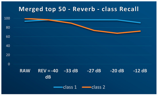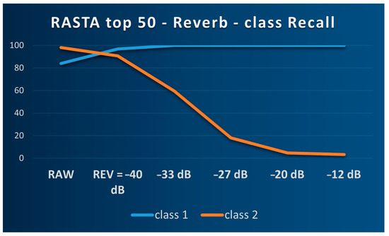 - Regarding reverb, we opted for the addition of reverb with different SNRs. Reverberation is very common in real-world speech recordings, and this is especially problematic when the acoustic environment consists of large rooms. For the purpose of this study, a convolutional reverb based on the Impulse Response (IR) of a real acoustic space was applied to the signals with the aid of REAPER®, version 7.15 (Cockos Inc., San Francisco, CA, USA [36]). To better reproduce real-world reverb situations, five different reverb volumes were used to generate progressively more reverberated audios. The amplitudes of the reverberated (wet) signals added to a dry signal with 0 dB gain are as follows, measured in dB and ordered from the least to the most intrusive: −40, −33, −27, −20, and −12. As an example, a reverb of −12 dB means that the wet signal was mixed lower than the dry, bringing it to a signal-to-reverb ratio of 12 dB or . The amount of reverb was chosen empirically by progressively worsening the intelligibility of the raw speech. More experiments were performed using also 0 dB and 10 dB reverb/wet signals, but the results were not relevant or were difficult to interpret, and thus were omitted.