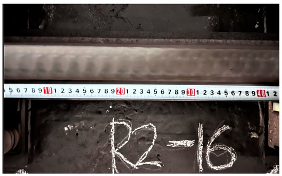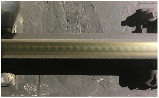 To analyze the increase in the 920 Hz band vibration frequency, the S10 section, where corrugation occurred, was examined. Figure 14 shows the rail corrugation in the S10 section. The wavelength of the corrugation was 24 mm, and when the vehicle was operated at 80 km/h, the vibration frequency caused by the corrugation, calculated using Equation (1), was 926 Hz. Here, is the vehicle speed, and is the wavelength of the corrugation.