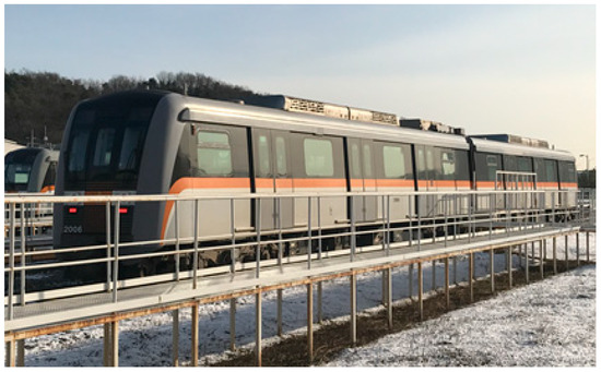 The light rail transit system consists of 43 trains, each comprising two cars, and operates autonomously. The maximum operational speed is 80 km/h, and the annual average mileage is approximately 120,000 km, which is substantial. The power supply method for the LRT is a third rail system, and the wheels are equipped with resilient wheels that exhibit excellent noise and vibration damping performance. Figure 2 shows the Incheon Line 2 LRT vehicle, and Table 2 presents the specifications of the LRT vehicle.