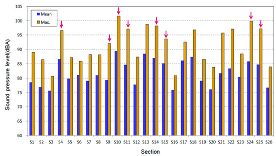 Figure 5 and Table 4 present the equivalent interior noise levels measured in each section under all vehicle maintenance conditions. Overall, the noise levels in sections with rail corrugation were significantly high, showing a similar trend across the different maintenance conditions of the vehicles.