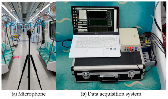 This study aims to identify the effect of vehicle maintenance conditions on abnormal interior noise by performing interior noise measurements under different maintenance conditions. International standards for noise measurement include ISO 3381, GB/T 3449-2011, and JIS E 4021-2008. In this study, noise measurements were conducted in accordance with KS I ISO 3381, which is identical to the widely adopted ISO 3381 [20,21,22,23]. As shown in Figure 4a, noise sensors were installed inside the vehicle, and the noise recorded during operation was stored using the data storage device shown in Figure 4b. Four test vehicles were selected, each reflecting different maintenance conditions, as shown in Table 3. Interior noise levels were measured during operation for each case, and equivalent noise levels were analyzed for segments between stations.